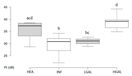 Box and whisker plot of the peak enhancement (PE) for healthy (HEA), inflammatory (INF), low-grade alimentary lymphoma (LGAL) and high-grade alimentary lymphoma (HGAL). a,b,c,d Values with different superscript letters differ significantly (p < 0.05).