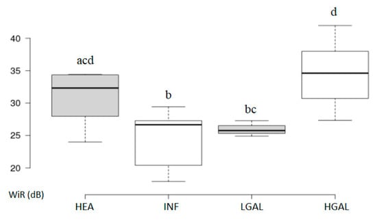Box and whisker plot of the wash-in rate (WiR) for healthy (HEA), inflammatory (INF), low-grade alimentary lymphoma (LGAL) and high-grade alimentary lymphoma (HGAL). a,b,c,d Values with different superscript letters differ significantly (p < 0.05).