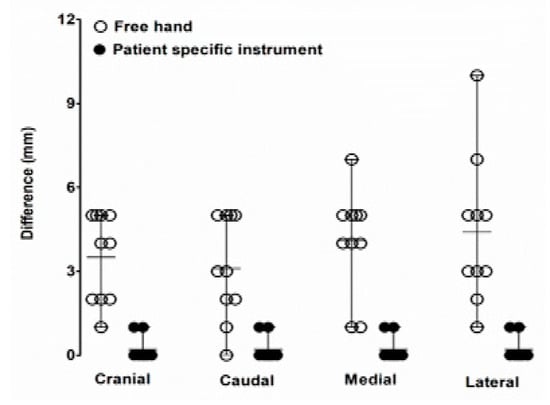 - Bosma, S.E.; Wong, K.C.; Paul, L.; Gerbers, J.G.; Jutte, P.C. A cadaveric comparative study on the surgical accuracy of freehand, computer navigation, and patient-specific instruments in joint-preserving bone tumor resections. Sarcoma 2018, 2018, 4065846. [Google Scholar] [CrossRef]