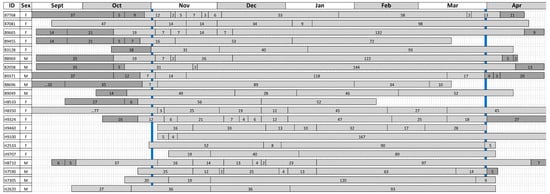 The pattern of nest use was highly variable, with several animals using the same nest site for extended periods before and/or during the hibernation period (Figure 1). There was no significant difference in the number of nests used by males and females within and between the two sites (Kruskal–Wallis test: H = 0.60, DF = 3, p = 0.896). Combining the data, hedgehogs used a median of five nests (mean ± SD = 5.5 ± 2.3) across the 151-day hibernation period. Thirteen animals (62%) used at least one site for ≥89 days.