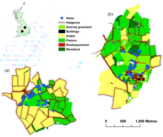 Data were collected from: (1) the Brackenhurst Campus (332 ha) of Nottingham Trent University, Nottinghamshire, UK (National Grid reference: SK695523); and (2) Hartpury University and College campus (339 ha), Gloucestershire, UK (National Grid reference: SO785237). Both sites were mixed commercial farms alongside a university campus, managed under the Entry level Environmental Stewardship Scheme [65]. Brackenhurst is dominated by arable fields (68.7%), with pasture fields, amenity grassland and woodland covering 24.4%, 1.9% and 2.7% of total land area, respectively. In contrast, Hartpury is dominated by pasture (34.8%) and amenity grassland (16.8%), with higher woodland (8.0%) and lower arable (30.8%) coverage than at Brackenhurst. Hedgerow length at each site is 27.1 km (Brackenhurst) and 16.9 km (Hartpury). Badgers were present at both locations: based on the numbers of setts at each site, and the frequency with which they have been photographed on motion activated trail cameras, badger density was considered comparable between the two locations. Hedgehog densities estimated in 2017 using two different methods (random encounter model based on data from trail cameras; spatial capture-recapture based on the capture history of animals along standardized transect routes) were 5.6–9.4 km−2 at Brackenhurst and 4.3–12.5 km−2 at Hartpury [66].