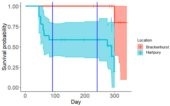 Kaplan–Meir survival functions for hedgehogs at Brackenhurst (n = 10) versus Hartpury (n = 21). Data from sexes and years (2015–2016 and 2016–2017) combined. Vertical blue lines indicate the start (1 November ) and end (31 March ) of the hibernation period.