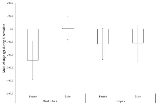 Mean (±SD) mass change during the hibernation period (1 November–31 March) in relation to site and sex (Brackenhurst: n = 5♀:5♂; Hartpury: n = 6♀:5♂).