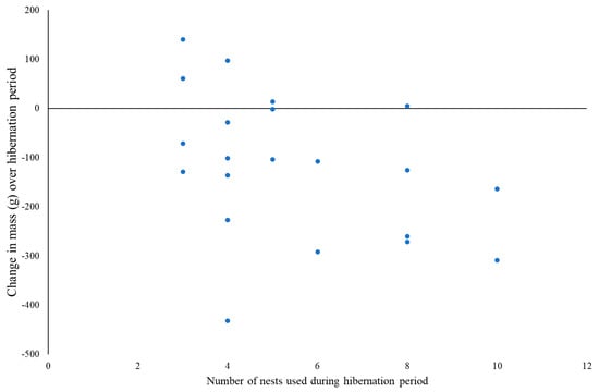 Relationship between number of nests used during the hibernation period (1 November –31 March) and the corresponding change in mass (g) over the hibernation period (n = 21).