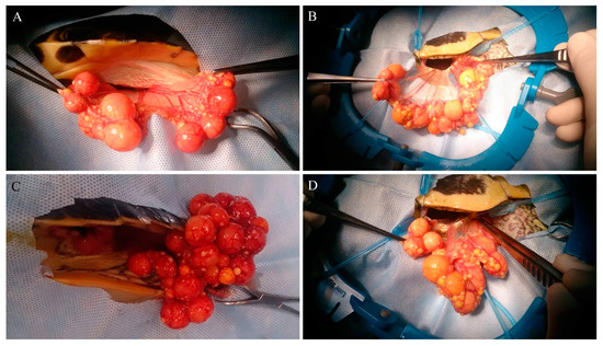 Once the ovary was identified, the avascular interfollicular connective tissue was grasped with straight Debakey forceps and gentle traction was applied to completely exteriorize the ovary from the breach and expose vascularization (Figure 2A,B). The ovarian vessels were ligated with stainless steel surgical ligation clips (Ligature Clip, Aesculap AG, Tuttlingen, Germany), and the mesovarium was transected with scissors. After resection of the ovary, the mesovarium was replaced inside the coelom, and an endoscopic inspection of the cavity was performed to verify hemostasis and check for residual follicles. For both groups, the ovary resection time was recorded from first grasping the interfollicular tissue to the endoscopic confirmation of total resection.