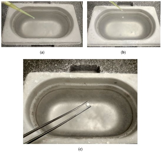 Images of the spermatozoa vitrification procedure, (a,b) 30 μL of spermatozoa suspension dropped into LN2 using a micropipette, (c) sphere formed after sperm vitrification.