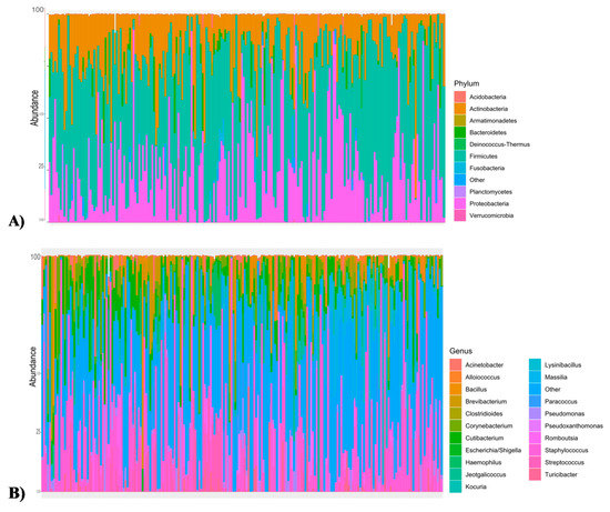 Barplot of taxonomic composition showing the relative abundance of the milk bacterial community in the Churra sheep breed at the phylum level (A) and at the genus level (B). Each bar represents a subject and each coloured box a bacterial taxon.
