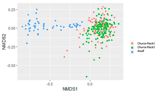 The similarity of bacterial communities between flocks. Non-metric Multidimensional Scaling (NMDS) ordination plot of the microbiota results obtained for sheep milk samples of Churra and Assaf sheep flocks. The distance between the samples is based on similarity in the amplicon sequences variant (ASV) composition of each sample calculated using the Bray-Curtis similarity index.