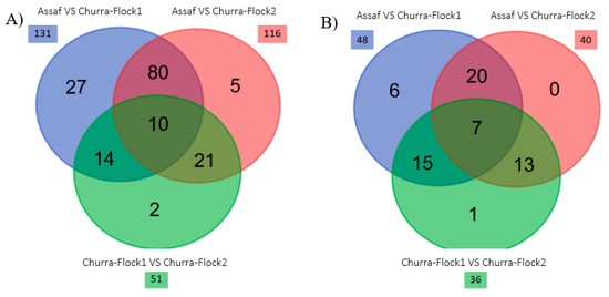 Differentially abundant genera (DAG) across the different flocks. (A) Venn diagram classifying all DAG reported by the DADA2 implemented pipeline. (B) Venn diagram classifying only DAG showing a relative abundance higher than 0.1%. Venn diagrams showing the relations between the DAG in the pairwise comparison of the considered subsets: Assaf versus Churra-Flock1 (blue), Assaf versus Churra-Flock2 (red), and Churra-Flock1 versus Churra-Flock2 (green). DAG were filtered with a threshold adjusted p-value ≤ 0.05 and an absolute log2 fold-change of ≥ 1.5. The total number of DAG for the different pairwise comparisons are indicated with an external square to the Venn diagram.