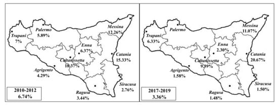 Bovine tuberculosis (bTB) prevalence rates recorded throughout the different provinces of Sicily, during the two investigated three-year periods (triennium 2010–2012 and triennium 2017–2019).