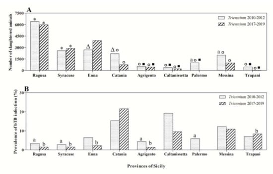 Number of slaughtered animals per province of Sicily (A) and prevalence of bovine tuberculosis (bTB) (B) during the triennia 2010–2012 and 2017–2019 with the related statistical significances found. Statistical significances: Δ vs. Triennium 2017–2019 (p < 0.01); * vs. all the other provinces (p < 0.001); ° vs. Enna (p < 0.01); □ vs. Catania and Messina (p < 0.01); a vs. Caltanissetta (Triennium 2010–2012, p < 0.05); b vs. Catania (Triennium 2017–2019, p < 0.01).