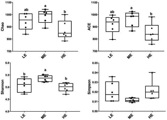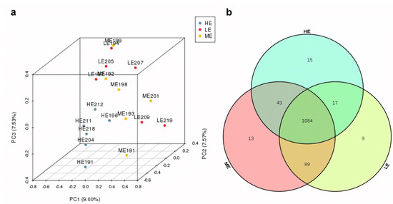 Ruminal fluid samples from 18 yaks were sequenced and generated an average of 29,207.1 ± 205.34 (mean ± SEM) qualified reads. In total, 1270 OTUs were identified at a 97% similarity degree. The coverage indices of each sample were greater than 99%, which indicated that the sequencing data were reflected accurately (Table S2). The ruminal microbiota of ME group had the highest Chao1, ACE, and Shannon indices (p < 0.05), whereas the ruminal microbiota of the HE group had the significantly lowest Chao1 and ACE indices in the three groups (p < 0.05) (Figure 1 and Table S2). The PCA analysis showed that samples of HE group had distinctly different microflora from the samples of ME and LE groups. The Venn diagram showed that 1084 OTUs were shared among all groups and 9, 13, and 15 OTUs were unique in the LE, ME, and HE groups, respectively, which indicated that most of the rumen bacteria were shared by yaks fed different energy level diets (Figure 2).