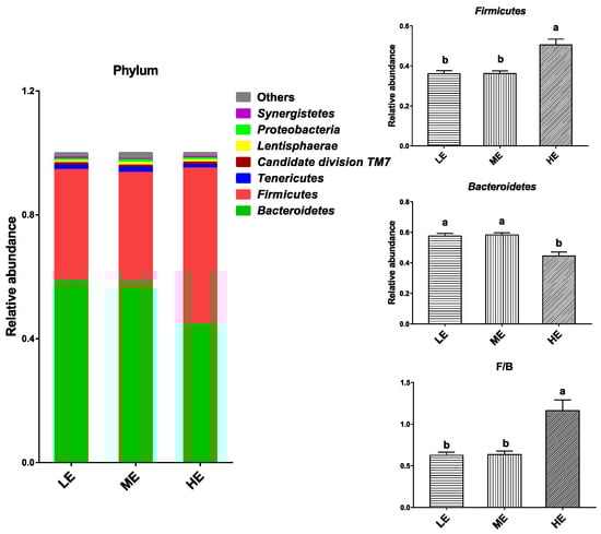In total, 16 phyla were identified from the rumen samples. The dominant bacterial phyla in the rumen of yaks (average abundance > 0.5% at least in one group) were Bacteroidetes (44.52–58.33%), Firmicutes (36.08–55.50%), Tenericutes (1.14–1.68%), Candidate division TM7 (0.66–0.79%), Lentisphaerae (0.65–0.86%), Proteobacteria (0.59–0.88%), and Synergistetes (0.35–0.55%). High dietary energy significantly increased relative abundance of Firmicutes and decreased relative abundance of Bacteroidetes (p < 0.05). The Firmicute population in the HE group was nearly 40% higher than that of the LE and ME groups, and the Bacteroidetes population in the HE group was about 23% lower than that of the LE and ME groups. Therefore, high dietary energy significantly increased the ratio of Firmicutes to Bacteroidetes (p < 0.05) (Figure 3 and Table S3).