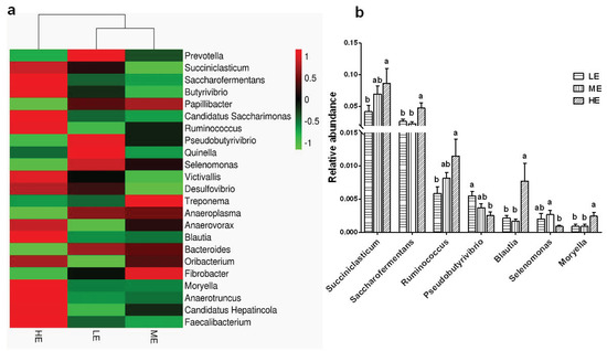 Effects of dietary energy levels on the yak rumen bacterial composition at the genus level. (a) Heatmap showing the average relative abundance of each genus taxon (relative abundance > 0.1%) in different groups. The Y-axis represents different bacterial genera, and the X-axis represents different groups. The relative abundances of bacterial genera are represented by color intensity according to the scale provided. (b) Bar graph showing the significantly fluctuant bacteria at the genera level. Values are means ± SEMs. Bars with different lowercase letter superscripts are significantly different (p < 0.05). Each group had 6 yaks.