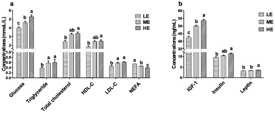 As the dietary energy levels increased, the serum glucose concentration significantly increased and the serum NEFA concentration significantly decreased (p < 0.05). Serum triglyceride and LDL-C concentrations of yaks in the HE and ME groups were significantly higher than those of LE group (p < 0.05). Serum total cholesterol and HDL-C concentrations of yaks in the HE group were significantly higher than those of the LE group (p < 0.05). Increasing dietary energy levels significantly increased the serum IGF-1 concentrations of yaks (p < 0.05). The serum leptin concentration of the HE group was significantly higher than that of the ME and LE groups (p < 0.05), and the serum insulin concentration of HE group was significantly higher than that of the LE group (p < 0.05) (Figure 5).