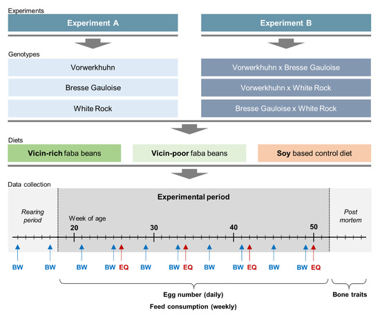 Schematic illustration of the experimental setup. In experiment A, three purebred chicken genotypes were allocated to one of three diets containing either faba beans differing in their vicin content or soybean. Experiment B comprised three crossbred genotypes, which were allocated to the same diets. In experiment A (B), 120 (132) hens per genotype were tested with two replicates per genotype × diet combination consisting of 20 (22) hens each. The data collection was identical in both experiments. Data on egg number, egg quality (EQ), feed consumption and body weight (BW) were collected as indicated. Post mortem, bone morphometry, bone mineral density, bone breaking strength and the cortical bone proportion were assessed.