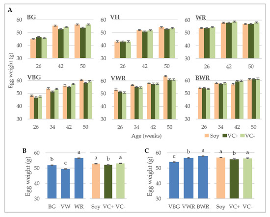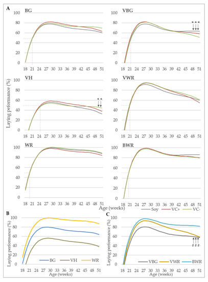 Figure 3 illustrates the laying performance over the course of the experimental period. In Figure 3A, the comparison of the feeding groups within genotypes is shown. In BG and WR no significant differences between the different diets were found, while in VH in the last two weeks of the experiment the difference between the VC− and the soy group became statistically significant with a difference of −5.56% and −12.02% in weeks 50 and 51, respectively. A significant difference between the soy and VC− group was also found in experiment B in VBG at the end of the experiment, but here the soy group showed a significantly higher laying performance in weeks 49–51 compared to the VC− group of 5.41–6.97%. In VWR and BWR no significant differences in the laying curve between the feeding groups could be detected.