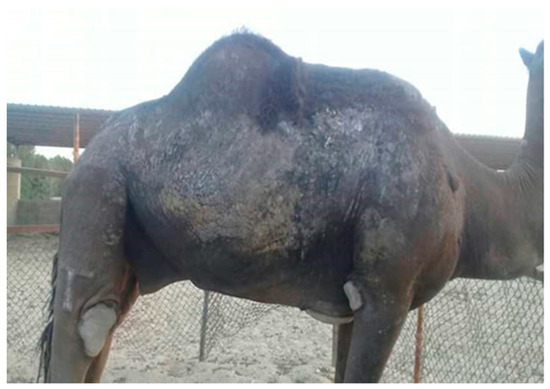 - Hakem, M.K.A.; Abu-Samra, M.T. Prevalence and Risk Factors Associated with Mange, Ringworm and Dermatophilus Infection in the One-Humped Camel (Camelus Dromedarius) in Al-Butana Area, El-Gazira State. Master’s Thesis, Sudan University of Science and Technology, Khartoum, Sudan, 2019. Available online: http://repository.sustech.edu/handle/123456789/23312 (accessed on 14 June 2020).