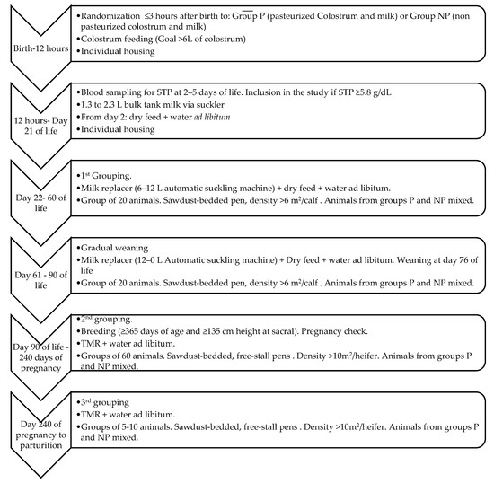 Blood samples were drawn from all calves at 2–5 days of life, and serum was obtained through centrifugation. Serum total protein (STP) (g/dL) was determined using a commercially available refractometer (AtagoMastersur/NE, Atago U.S.A. Inc., Bellevue, WA, USA). Only female Holstein calves, with an STP value ≥ 5.8 g/dL, associated with appropriate colostrum ingestion [4,18,19], entered the study. All calves were offered fresh water and dry feed ad libitum from day 2 until the end of the study. Calves were individually housed during the first 21 days of life. From day 22 until weaning at day 76, calves were moved into groups of 20 animals in a sawdust-bedded pen. The group density was 6 m2/calf during the pre-weaning period. This grouping was assigned randomly, mixing animals from groups NP and P to avoid any confounding effects due to housing. Feeding throughout this period was based on MR supplied by an automatic suckling machine (The Dairy Feed J V640+, GEA, Düsseldorf, Germany). MR daily intake was increased from day 22 (6 L/day) until day 60 with a maximum of 12 L/day. This feeding system allows each calf a maximum volume of 3 L per intake and a minimum time interval between intakes of two hours. Finally, daily MR intake decreased from day 61 until weaning at day 76. The heifers were comingled in groups of 60 animals per pen between 90 to 240 days of pregnancy, maintaining the initial groups together. Housing was in sawdust-bedded, free-stall pens and a minimum density of >10 m2/heifer was always guaranteed. Feeding after weaning included a total mixed ration based on hay, rye grass silage, alfalfa, corn pastone, and water ad libitum. The timeline of the calf- and heifer-rearing process is detailed in Figure 1.