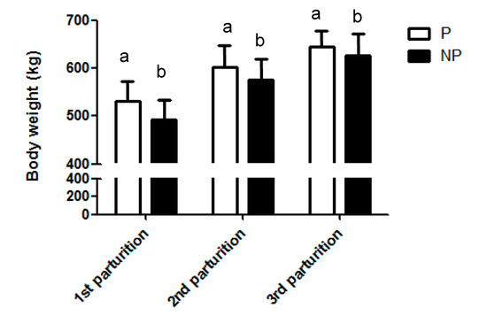 Body weight (BW) at birth was very similar (p = 0.98) between the NP (38.7 ± 1.1 kg) and P groups (38.6 ± 1.1 kg). Animals in the NP group were significantly lighter at first calving (492.6 ± 3.8 kg) compared to P group (531.7 ± 3.8 kg) and this difference was also present in the subsequent calvings (575.1 ± 4.6 vs. 602.0 ± 4.6 kg at second calving and 626.4 ± 5.3 vs. 645.9 ± 5.3 kg at third calving) (p <0.01) (Table 1 and Figure 2).
