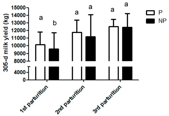 305-day milk yield (kg) depending on the number of parturition and experimental Group (NP vs. P Group). Bars with different superscripts (a, b) showed statistically significant differences (p <0.05).