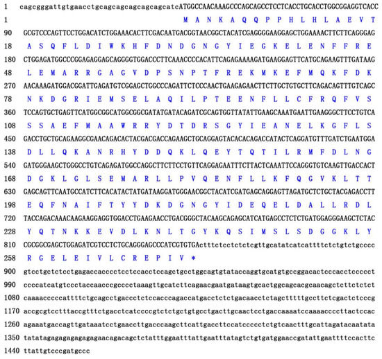 RNA was reverse-transcribed after treatment with DNase I as follows: Total RNA of 1000 ng and OligodT Primer (50 μM) of 1 μL, supplemented with ddH2O until reaching 10 μL, at 70 °C for 10 min, and then placed on ice immediately for 5 min. The following reagents were added: 5 × M-MLV buffer, 5 μL; Rnase Inhibitor (25 U), 1 μL; M-MLVRtase (200 U, Promega, Madison, Wisconsin, USA), 1 μL; dNTP mixture (10 μM), 1 μL; and ddH2O until reaching 10 μL. The reverse transcription reaction was run at 42 °C for 60 min and 75 °C for 15 min. The obtained cDNA was stored at −20 °C.
