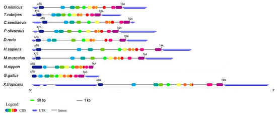 Gene structure of the P. olivaceus calb2 and its counterparts from other vertebrates. The color frame and black line represent exons and introns, respectively. ATG and TAG (TGA, TAA) indicate a start and stop codon, respectively.