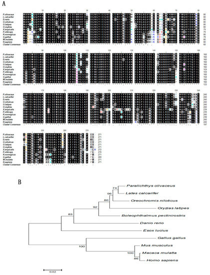 Molecular phylogenetic analysis of CALB2. (A) Amino acid sequence alignment of the P. olivaceus CALB2 with that of other species (light black blocks show identical amino acid residues for the sequences shown); (B) phylogenetic tree of the P. olivaceus CALB2 relative to the homologues from other vertebrates (bootstrap values are shown at the branch points).