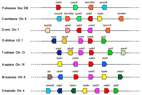 Synteny maps for the P. olivaceus calb2 on the scaffold and its counterparts from other vertebrate chromosomes constructed using the Ensembl Genome Browser (http://www.ensembl.org). The bar lengths are not proportional to the distances between genes. Gene symbols were determined by Browser. The direction of the arrows indicates the gene orientation. Chr, chromosome; LG, linkage group; Sca, scaffold.