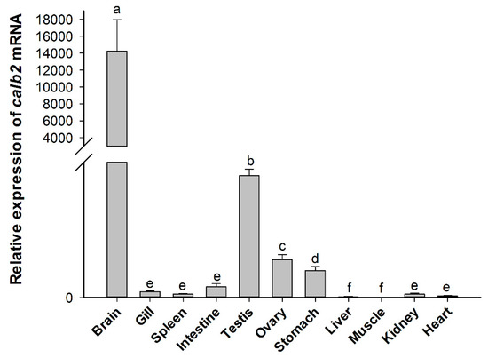 Relative expression levels of calb2 mRNA in different tissues from P. olivaceus. Each gene was calculated based on the level of expression in the liver. The different alphabetic symbols represent statistically significant differences (p < 0.05).