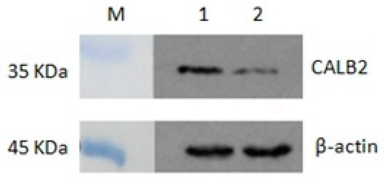 Calretinin (CALB2) is a Ca2+-binding protein, with a typical EF-hand calcium binding domain that can be reversibly combined with Ca2+ as a calcium receptor. CALB2, together with parvalbumin and calbindin-28kD, belongs to the superfamily of Ca2+-binding proteins, and was first discovered by Rogers in the retina of a chicken [1,2,3]. The main role of CALB2 is as a sensor and buffer of intracellular Ca2+ to prevent Ca2+ overload [4]. Ca2+ is an important secondary messenger, activating downstream protease via the PKC or CAM pathway, and CALB2 is thus involved in skeletal muscle/myocardial contraction, nerve reaction impulse conduction, steroid hormone synthesis and application, and endocrine and immune systems. It also plays an important role in cell differentiation, development, proliferation, necrosis, and apoptosis [5,6,7]. For example, after 5-fluorouracil (5-FU) treatment of the HCT116 CRC cell line, CALB2 was involved in apoptosis induction through the inherent mitochondrial pathway, suggesting that CALB2 may be an important mediator of 5-Fu-induced cell death [7]. Recently, newly identified lncRNA CALB2 was found to regulate RUNX2 expression as a Mir-30b-3P sponge, thus promoting the differentiation of hDPSCs odontoblast cells, and the LncRNA CALB2/Mir-30b-3P/RUNX2 axis may be a new therapeutic target for promoting odontogenesis [8].