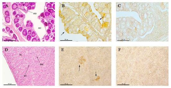 The structures of the testis and ovary of P. olivaceus were observed through paraffin section and HE staining (Figure 7A,D). The spawning plates of the ovary were filled with stage II primary oocytes, with a round or irregular ellipse shape, and the cytoplasm was homogeneous. Transparent oil balls appeared in the near nuclear membrane of some oocytes (Figure 7A). The inside of the testis was divided into many seminal lobules by connective tissue; lobules were tightly packed, and the spermatogonium was round or elliptical, with a weakly stained cytoplasm (Figure 7D). Immunohistochemistry showed the expression of CALB2 in the ovarian germ epithelium (Figure 7B). However, no obvious immune signals were detected in oocytes. There were positive signals in the mesenchymal cells from the seminiferous lobules in the testis (Figure 7E).