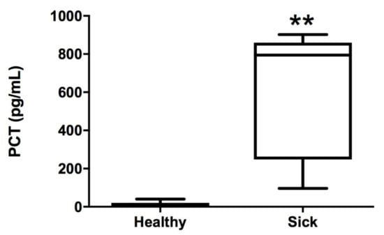 Concentrations of PCT measured by the rcPCT kit in healthy and sick canine plasma samples (** p < 0.01).