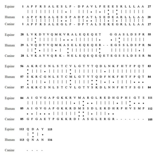 Alignment of the amino acid sequences of equine–human–canine procalcitonin. Numbers indicate amino acids. The symbols between the amino acid sequences represent conserved sequences (|), conservative mutations that are different amino acids with similar biochemistry proprieties such as hydrophobicity, size and charge (:), semi-conservative mutations (·), and gaps (-).