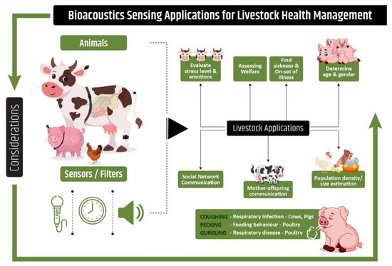 Acoustic monitoring (or vocalization measurement) is a non-invasive and an accurate method of measuring biological responses in livestock; it can be used as an indicator of animal well-being in precision livestock farming, which focusses on addressing animal welfare concerns by facilitating the automated, continuous monitoring of livestock and enabling timely and appropriate interventions [96].