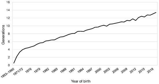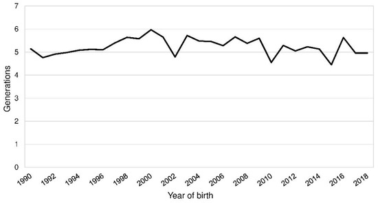 Mean complete generations by the year of birth of Polish Lowland Sheepdogs (PONs).