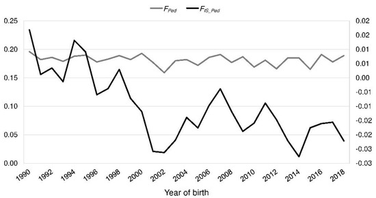 Inbreeding coefficient (FPed) and fixation index FIS_Ped by the year of birth of the Polish Lowland Sheepdog reference population.