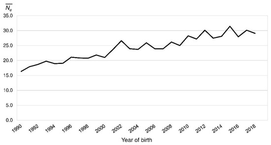 Realized effective population size () by the year of birth of the Polish Lowland Sheepdog reference population.