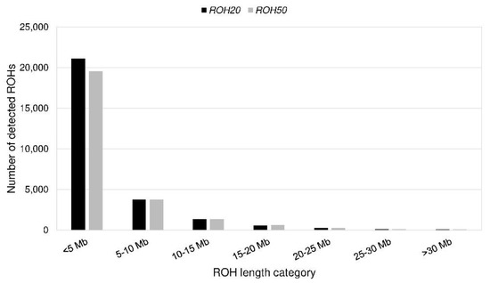 Number of detected runs of homozygosity (ROHs) per length category for ROH20 and ROH50.