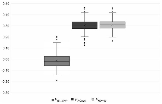 The inbreeding coefficient FROH and fixation index FIS_SNP were estimated using the software SAS, version 9.4 (Statistical Analysis System, Cary, NC, USA, 2019). FROH was calculated as a proportion of the length of all ROHs to the total length of all autosomes covered by SNPs [37]. FIS-values for each individual (i) were calculated as: