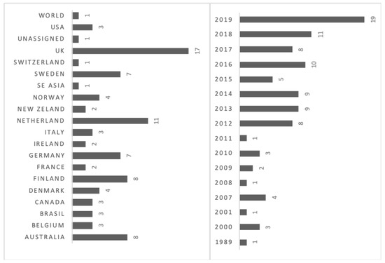 Number of reviewed articles (n = 96) focused on farmers’ perceptions, attitudes, values, knowledge of farm animal welfare (FAW) classified by countries and years of publication. Publications could have more than one country.