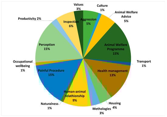 Range (%) of topics in the reviewed articles (n = 96) focused on farmers’ perceptions, attitudes, values, knowledge on farm animal welfare (FAW).