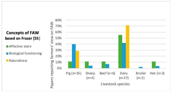 Percentage of publications reporting farmers’ (broilers, beef, dairy, hens, pigs, and sheep) views of farm animal welfare (FAW) based on Fraser’s Three Constructs [56].