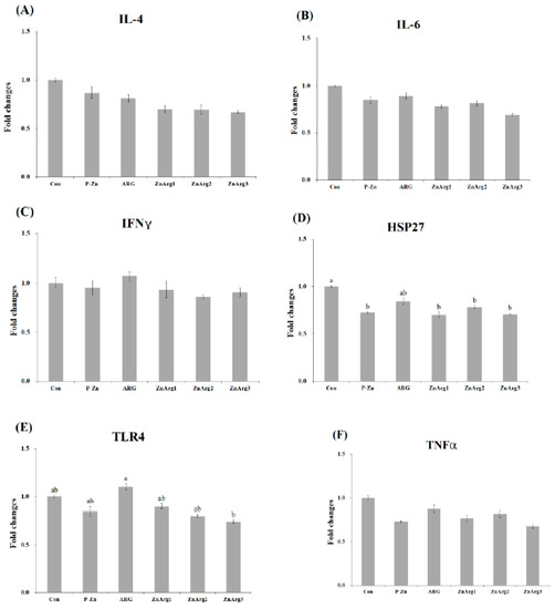 Relative expression of, (A) interleukin-4 (IL-4), (B) interleukin-6 (IL-6), (C) interferon-γ (IFNγ), (D) heat shock protein-27 (HSP27), (E) toll like receptor-4 (TLR4), and (F) tumor necrosis factor-α (TNF-α) in the liver of weanling piglets. Error bars represent standard error of means. Bars with different letters (a~b) differ significantly across all 6 treatment groups (p < 0.05). Con: 1.1% Arg; P-ZnO: 1.1% Arg + 2500 mg Zn/kg diet; ARG: 1.6% Arg; ZnArg1: 1.6% Arg + 500 mg Zn/kg diet; ZnArg2: 1.6% Arg + 1000 mg Zn/kg diet; ZnArg3: 1.6% Arg + 2500 mg Zn/kg diet.