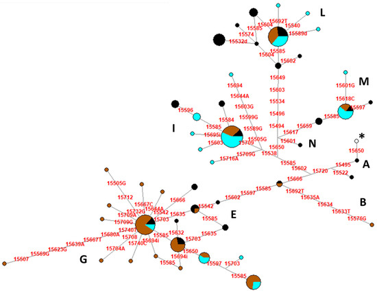 Median-Joining Network based on control-region sequences (nps 15,491–15,740) of Sardinian horse breeds. The asterisk indicates the haplotype identical to ERS. Three sequences not classified in mitochondrial DNA (mtDNA) haplogroups (JF804119, JF804147, and JF804151) were excluded from the analysis. Circles represent the haplotypes and are proportional to the observed frequency in 175 Sardinian horses (Table S2). Capital letters refer to mtDNA haplogroups, while colors indicate the different breeds: Giara (brown), Sarcidano (light blue), and Sardinian Anglo-Arab (black).