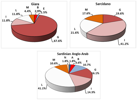 All haplotypes were classified in haplogroups, except for three sequences (JF804119, JF804147, and JF804151) from Morelli et al., 2014 [15], and a total of eight (A, B, E, G, I, L, M, and N) mtDNA lineages were identified, with the highest frequencies for G, L, and I (37%, 24%, and 21%, respectively) (Table S3). The highest maternal variability was found in Sardinian Anglo-Arab, which showed all eight haplogroups, followed by Giara, with six mtDNA lineages, and then by Sarcidano, presenting only four haplogroups (Figure 4).