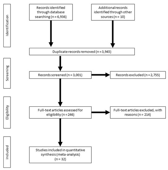 The literature search was conducted in PubMed [20], ScienceDirect [21], and Google Scholar [22] using the search terms “dairy cow AND Ovsynch”. Additional manuscripts were obtained directly from researchers in the field of reproductive biology. Results from the online search and personal communications were assessed individually for consideration for the meta-analysis. Figure 1 depicts a PRISMA diagram [23] of the flow of data collection for the meta-analysis. After the initial search and screening, 246 publications were assessed for eligibility. From those, 214 experiments were excluded because of the following reasons: lack of details on timed AI protocols (35 experiments); presence of a CL at or ovulatory response after G1 not evaluated (105 experiments); data on P/AI not reported for individual groups (e.g., CL versus no CL; 35 experiments); exogenous P4 supplementation in all cows (20 experiments); heifers as experimental units (10 experiments); review article or meta-analysis (9 experiments).
