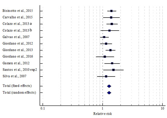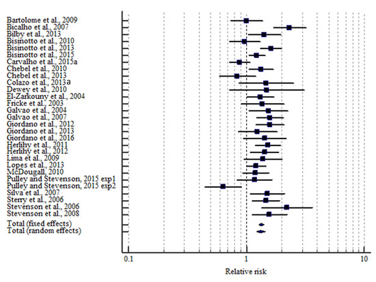 As a control group, we either used cows having no functional CL at G1 or cows that did not ovulate after G1. We calculated the relative risk (RR) for being diagnosed pregnant 32 d after TAI using a fixed effects and a random effects model, respectively. Under the fixed effects model, we assumed that all the experimental groups came from a common population and that the effect size regarding P/AI is not significantly different among the different trials as described by the heterogeneity (I2). However, if there is a significant heterogeneity, the random effects model may be more appropriate, in which both the random variation within the experimental group and the variation between the different experimental groups is incorporated [48]. MedCalc uses the Mantel–Haenszel method for calculating the weighted summary RR under the fixed effects model. The heterogeneity statistic is incorporated to calculate the summary RR under the random effects model [49].