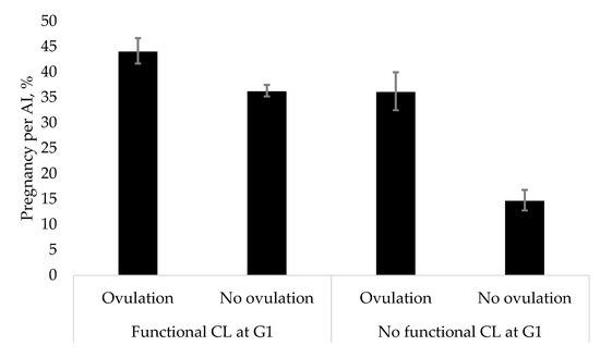 It was shown in multiple studies that ovulation to G1 in an Ovsynch protocol improved P/AI [10,11,12]. Ovulation and GnRH-induced LH release are suppressed in the presence of a CL and at larger concentrations of progesterone in dairy cattle [13,14]. Therefore, cows having intermediate P4 concentration at G1 have favorable P/AI [15].