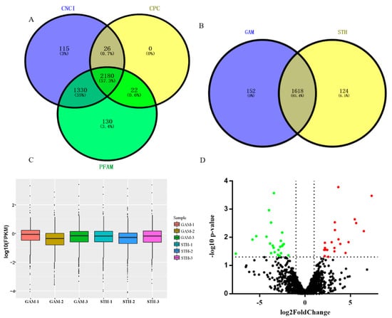 For these pooled samples from mammary gland tissues of lactating STH and GAM ewes, their clean reads and mapped results to the ovine reference genome have been described in our previous study []. A total of 7201 transcripts were obtained in the study. After removing transcripts with less than 200 bp and transcripts with a single exon, an average of 3928 transcripts were found. The coding potential of these transcripts was analyzed and 2180 lncRNAs were then screened (Figure 1A).